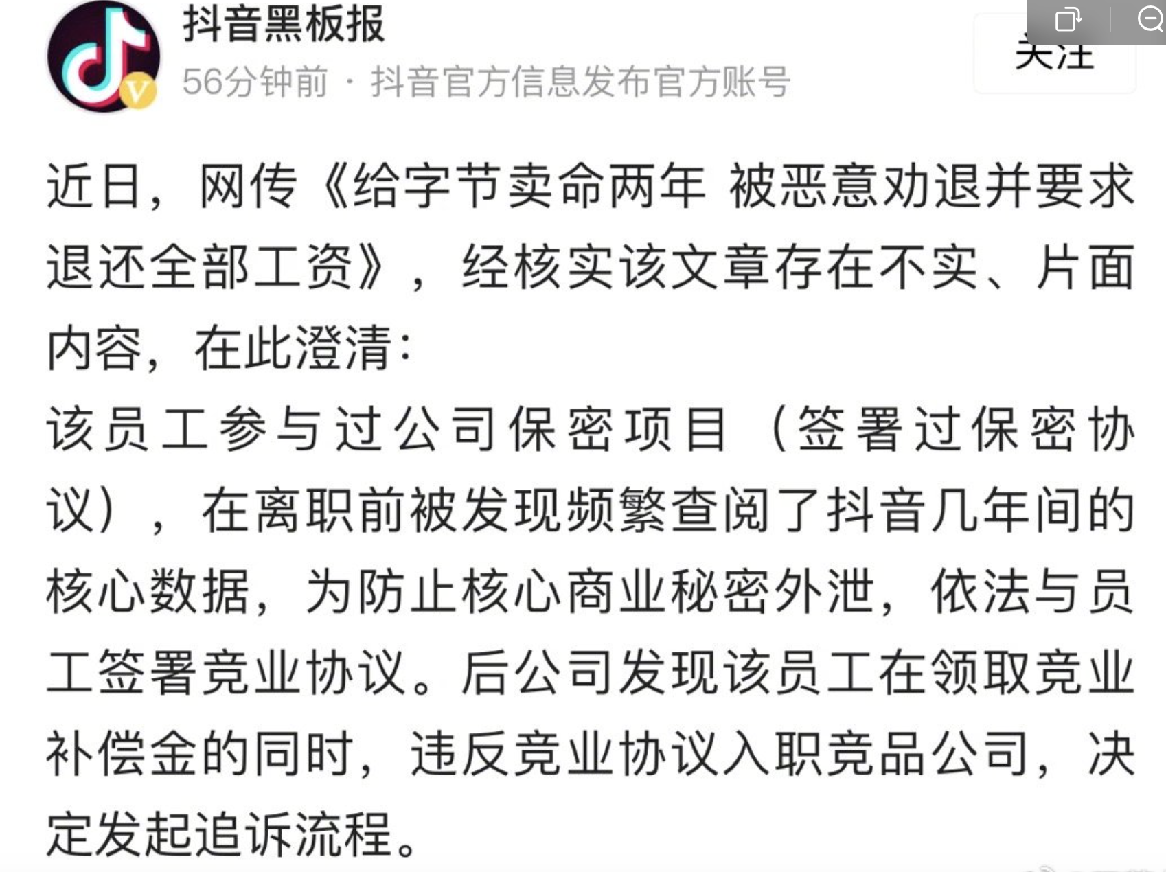该员工认为抖音方面滥用竞业协议,并提到其在仲裁阶段主张竞业协议属被迫签署。抖音方面则称,该员工参与过公司保密项目,为防止商业机密外泄,依法签署竞业协议,在劳动合同签署时就已经完成,离职前签署的是竞业开始通知书。