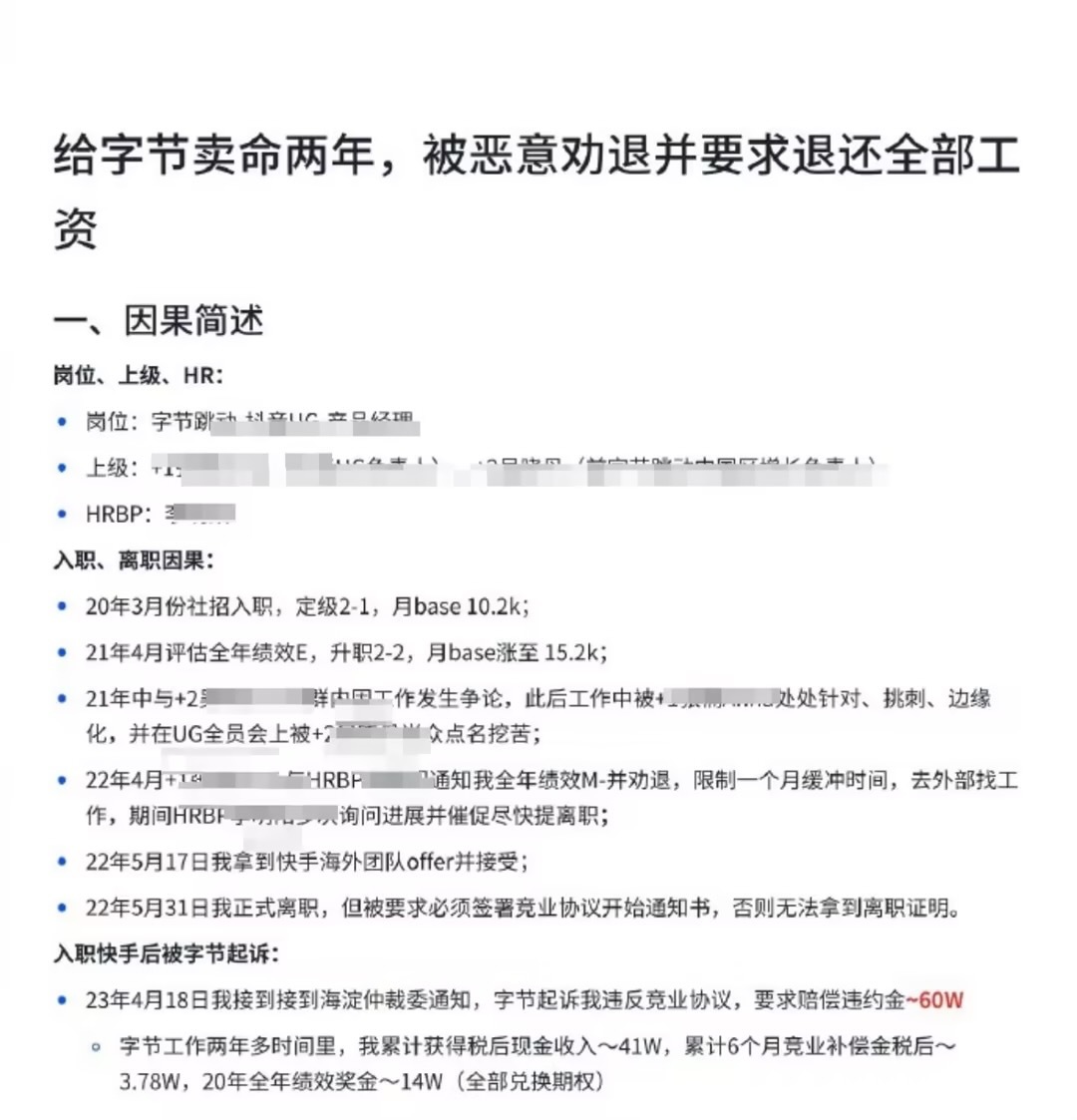 据网传文章作者自述,他曾担任抖音UG产品经理,2020年3月社招入职,2022年4月被劝退,5月正式离职。离职前数日已拿到快手海外团队的入职通知,但被抖音要求必须签署竞业协议开始通知书,否则无法拿到离职证明。