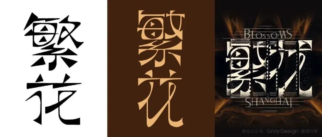 从鲁迅先生“萌芽体”获取灵感后,剧名“繁花”二字在标准字的设计上也经历了多次的迭代演变:从2020年、2021年、2022年至今,版式上从竖排变成了横排;在字体的细节处理上,增加了不少横线、三角形和纹理等装饰元素,并增加了英文英文“Blossoms Shanghai”字样,看着越来越“繁”了。