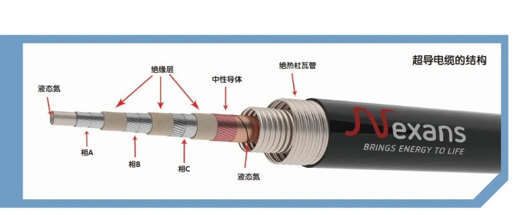 1996年,美欧科学家共同研制出了第一条高温超导电缆。1998年,中国科学院电工所研制出了我国第1条一米长的超导电缆,成为了我国自主研发超导电缆的开端。与传统电缆相比,超导电缆的结构要复杂一些:它就像一支“三色圆珠笔”,共分为外护套、杜瓦管和超导电缆芯等多层。最中间的是拇指粗的超导电缆芯,外护套跟常规电缆外护套一样。外护套内是双层不锈钢材质的高真空绝热杜瓦管,由于这类超导材料需要在极低温度下才能表现出超导特性,因此运行时,杜瓦管里将充满液氮,给电缆芯降温。