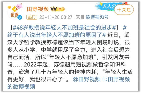 武汉大学的苏德超教授也认为,年轻人不愿意加班说明社会进步了。