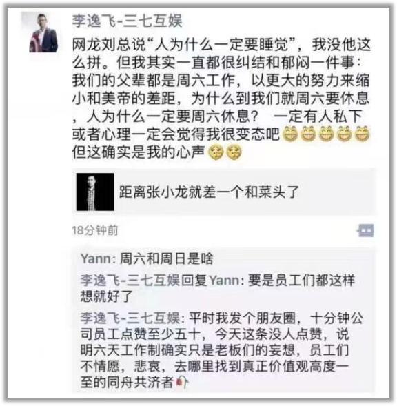 这些话出自三七互娱创始人兼董事长李逸飞的朋友圈。