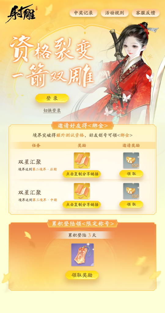 网易大世界武侠RPG新游《射雕》已于1月12日拉开“三端漫游”终测的序幕,本次测试规模达到3万人以上,而且还开放了“测试资格裂变”的活动,顾名思义,已有资格的玩家可以通过提升武学境界等方式分享资格给好友,还未获得资格的玩家可以留意这一方法。