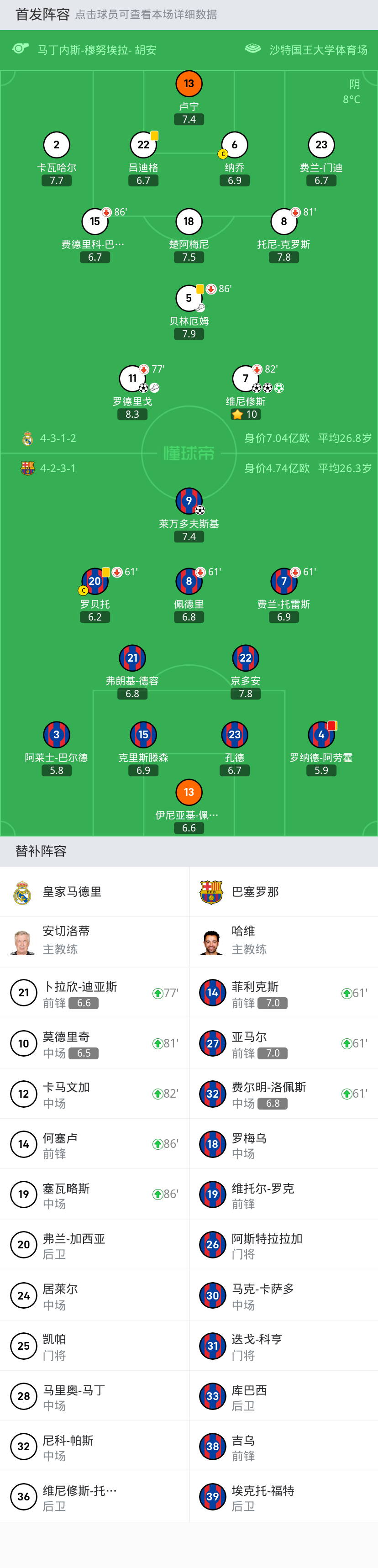 替换下场:81'8-托尼-克罗斯, 86'15-费德里科-巴尔韦德, 82'7-维尼修斯, 77'11-罗德里戈, 86'5-贝林厄姆