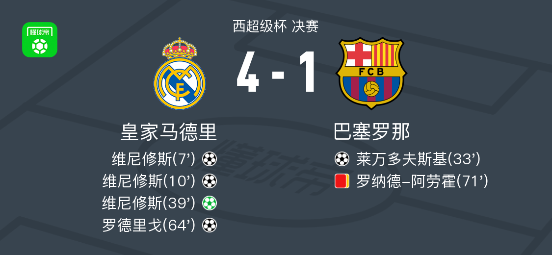 北京时间1月15日西超级杯 决赛,皇家马德里主场对阵巴塞罗那。皇家马德里维尼修斯帽子戏法,罗德里戈破门。巴塞罗那莱万多夫斯基破门。最终比分4-1。