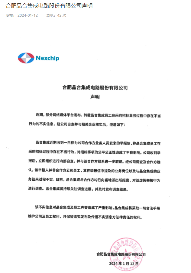 晶合集成于1月12日下午在官网发表澄清声明称,其近期收到一自称为公司合作方业务人员发来的举报信,称晶合集成员工在采购招标过程中存在不当行为,对招标事项的公平公正性造成了不良影响。公司收到举报后,立即组织进行内部自查,并与该合作方联系进一步取证。