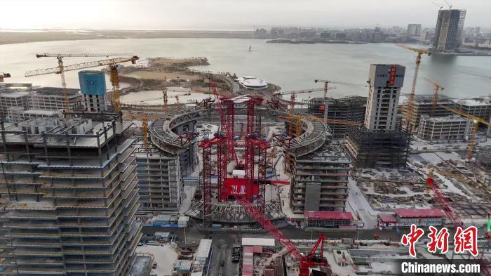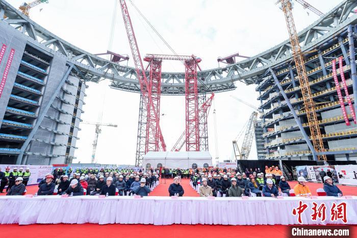 1月15日,中国(上海)自由贸易试验区临港新片区(以下简称临港新片区)城市地标“荣耀之环”钢结构幕墙一体化工程起吊合龙。上海自贸区临港新片区管委会供图