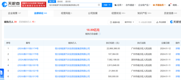 【CNMO新闻】天眼查App显示,近日,恒大新能源汽车投资控股集团有限公司新增6条被执行人信息,执行标的合计3339万余元,涉及建设工程施工合同纠纷、劳动争议等案件,部分案件被执行人还包括恒大新能源汽车(广东)有限公司、山东致派信息科技有限公司等。
