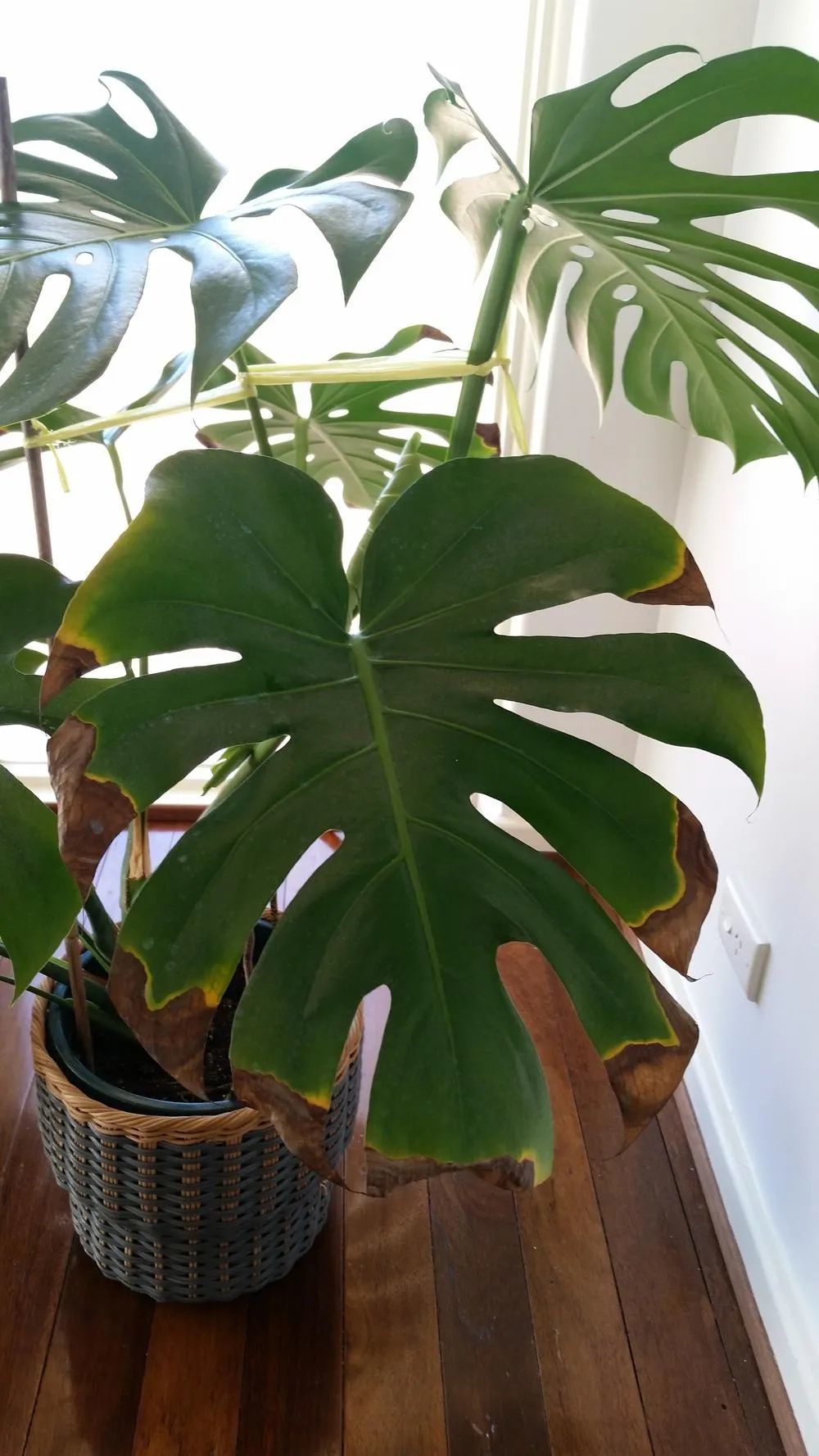 龟背竹是一种生长在雨林里的观叶植物,原本是生长在树荫下的,它们会比较喜欢散射光,如果在光照比较强烈的环境下,阳光暴晒加上高温就容易烧伤叶子,叶子尖端会首先变成褐色,会慢慢干枯发黄,那些干黄叶子的颜色会比较浅。