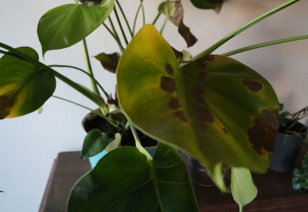 如果已经有很长一段时间没有给盆土浇水,土壤看起来已经干得发白了,而且龟背竹的茎叶出现萎缩,叶子也出现蜷缩的情况,那就是过度干旱导致叶子发黄。