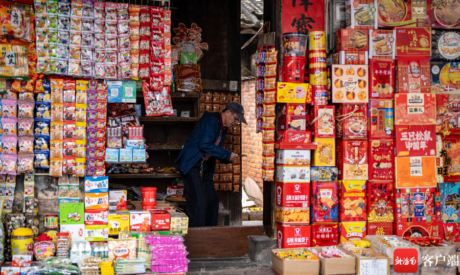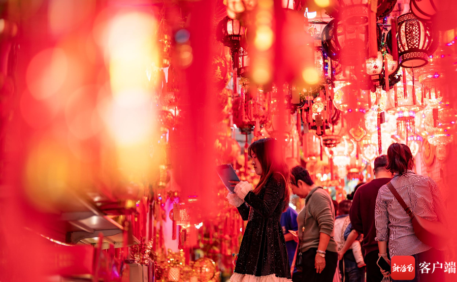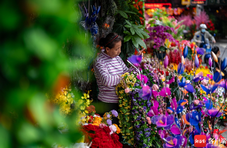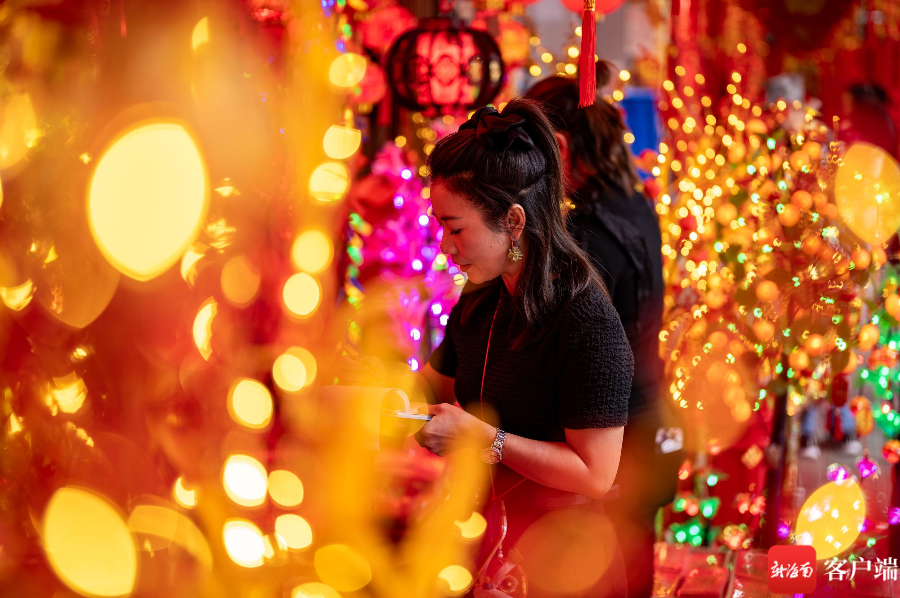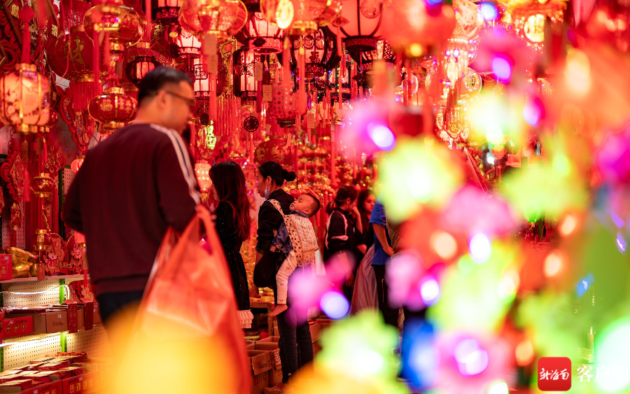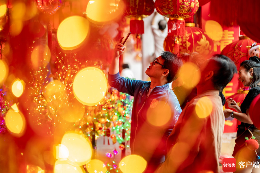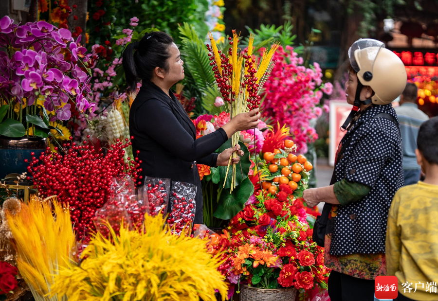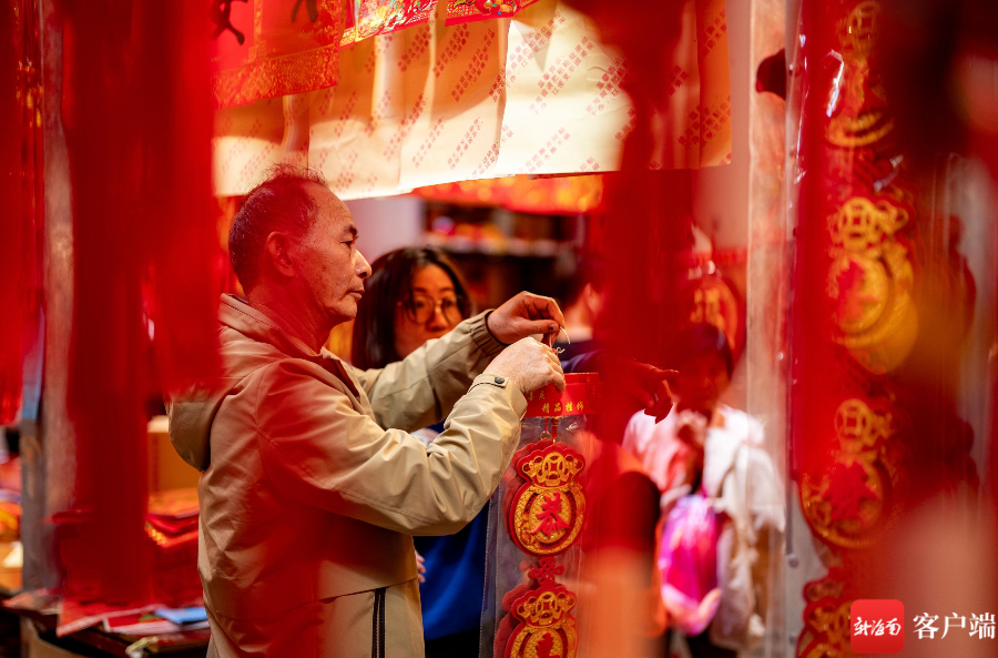 在海口博爱南街道上,红色灯笼已经高高挂起,龙年公仔摆设在外,春联批发店里店员忙碌着摆放货物,已经有不少市民在挑选春联,也有市民选择老街上的手写春联。在花艺街道上,市民也在选择购买仿真花,为布置家里的过年气氛提前忙碌。