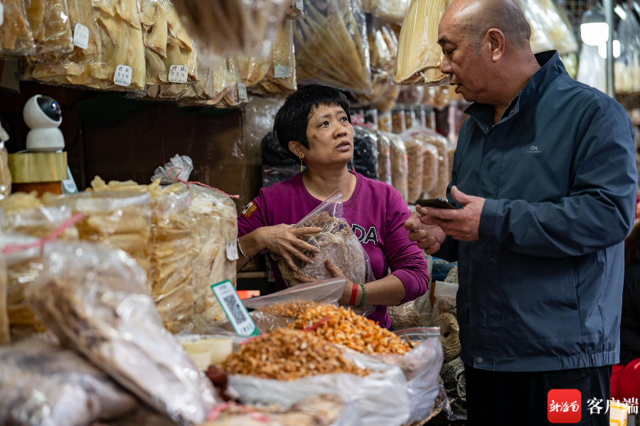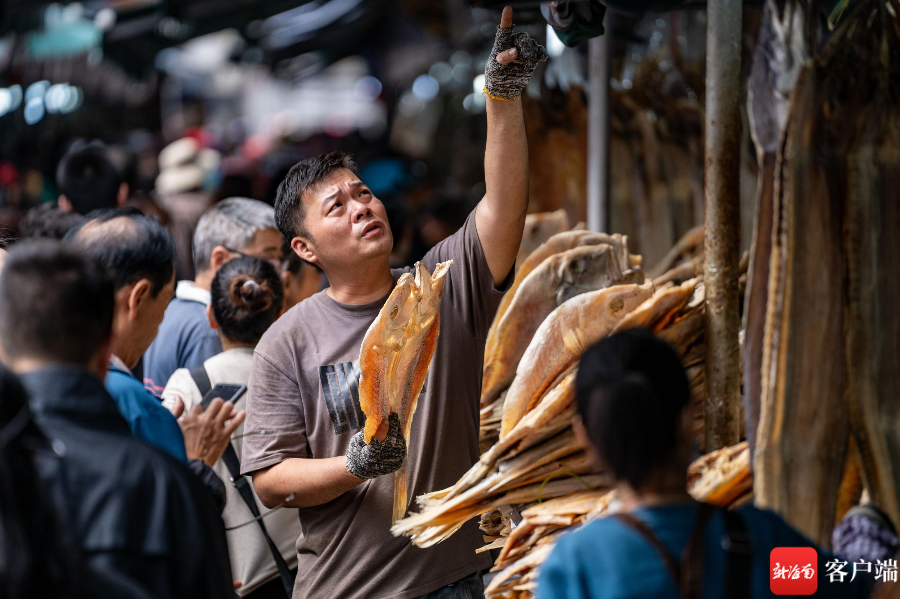 近日,在海口骑楼老街东门市场海鲜干货区,前来购买红鱼、鱿鱼的市民络绎不绝。不少市民都都表示,还有二十多天就是春节了,得提前来订购过年的食材。