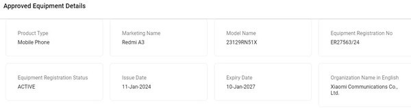 照片显示,Redmi A3在TDRA网站上注册,型号为23129RN51X。遗憾的是,该认证并未透露新机任何重要细节,例如设备的规格或价格。此前不久,Redmi A3也出现在了NBTC认证网站上,该网站显示这款手机将提供2G、3G和4G LTE支持。