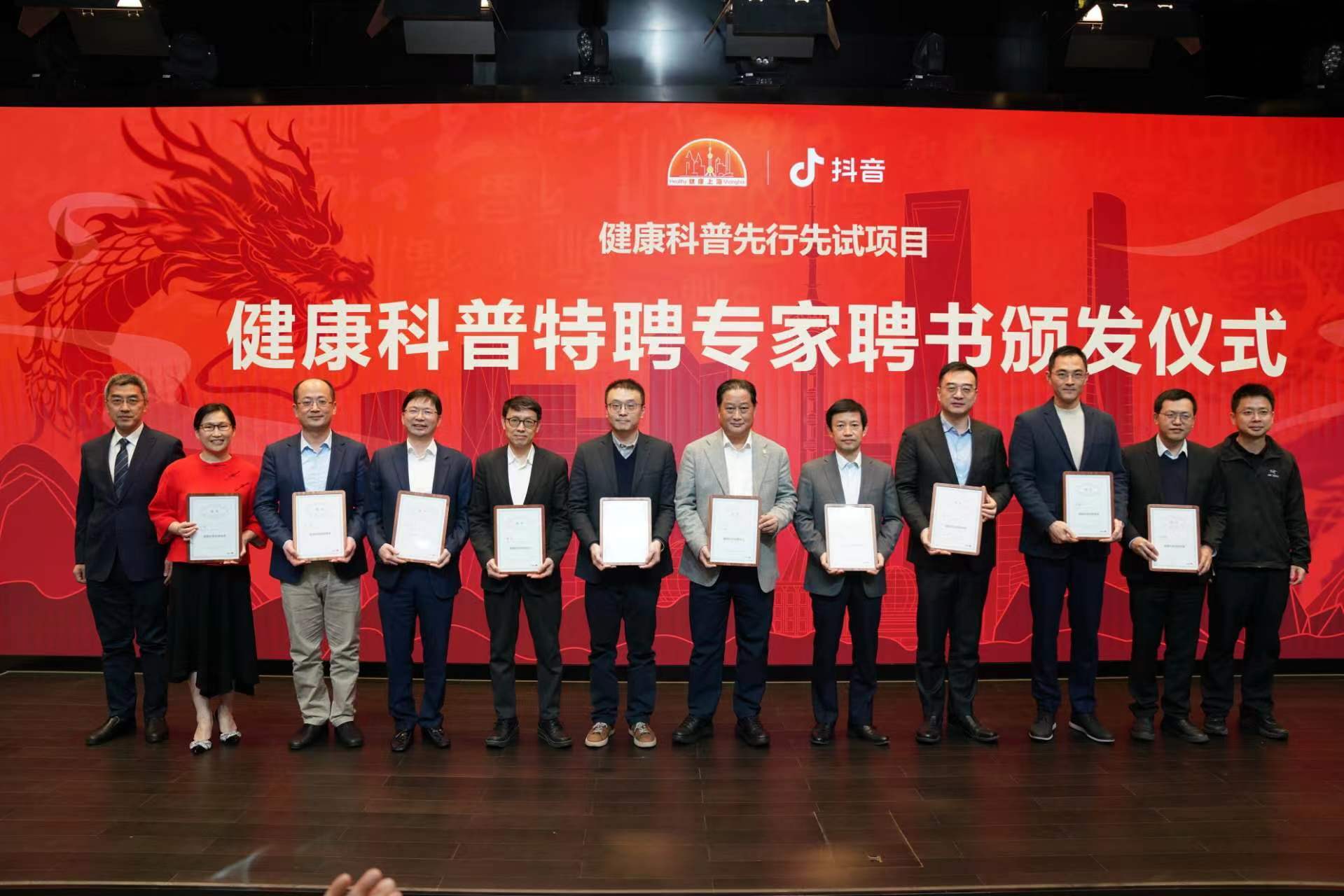 现场特聘中国工程院院士贾伟平等10位权威专家为健康科普先行先试项目专家,并邀请10位医务人员代表为抖音认证专家。