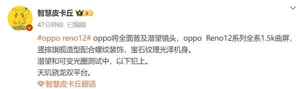 博主还透露,OPPO将全面普及潜望镜头,潜望和可变光圈正在测试中。这意味着无论是标准版还是Pro版,用户都能享受到高质量的长焦拍摄效果。再也不用担心远处的风景、演唱会或是体育赛事模糊不清。在处理器方面,OPPO Reno12系列将搭载天玑和骁龙双平台。