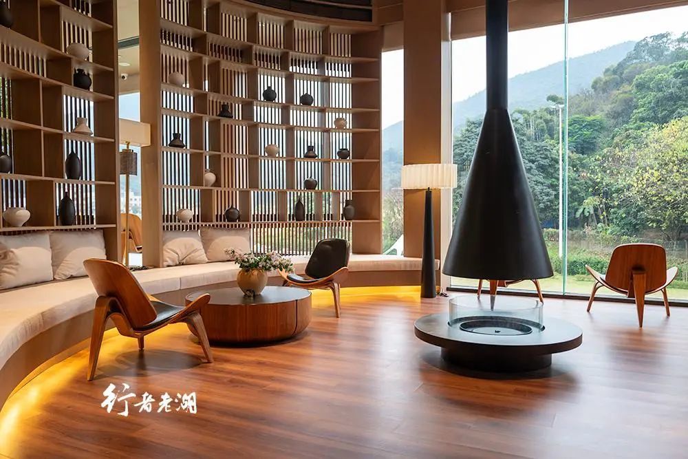 第二家是派潭镇密石村的宿山房,追求设计感的星级民宿,配备咖啡厅、茶室、影院、温泉和露营地。在溪流和古木之间,高大的厅堂,敞亮的玻璃墙,简约现代风格与自然景色相得益彰。