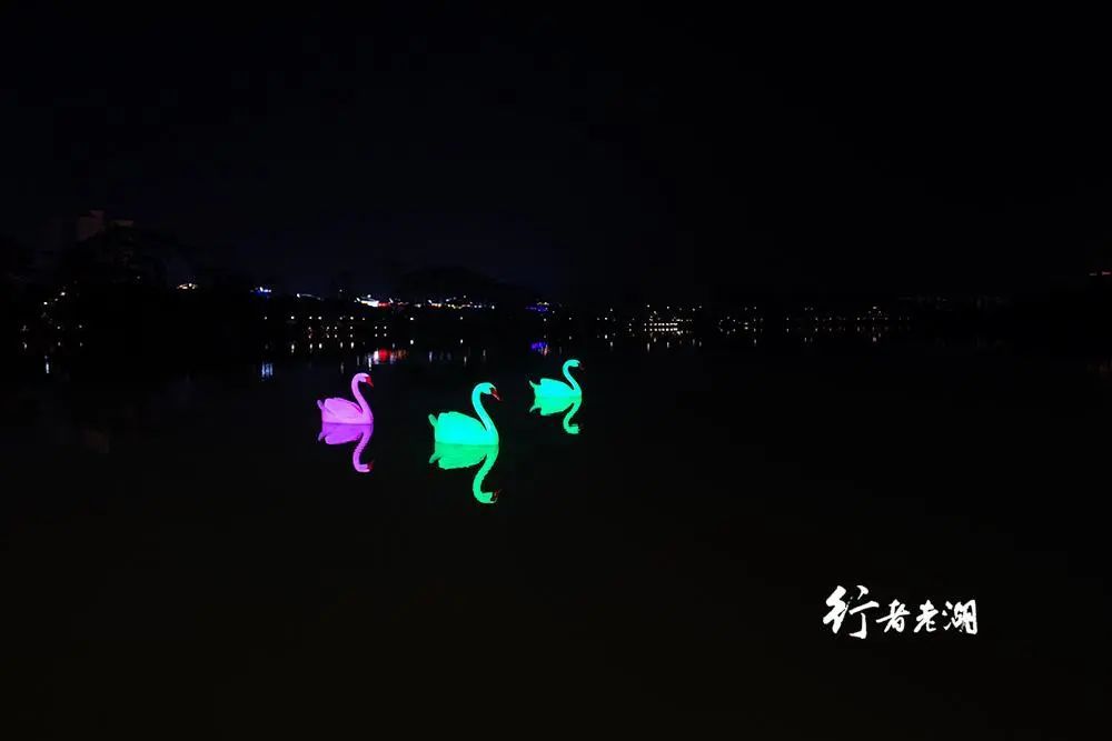 荔湖公园值得一游,尤其是在傍晚五点到晚上九点,行走在湖中小路,一路观赏荔湖艺术季的11组光影艺术作品,光影秀融合了城市、艺术、人文和自然的元素,既值得观赏又有参与的趣味。其中,几只会游动的发光“天鹅”吸引了许多游人的目光。