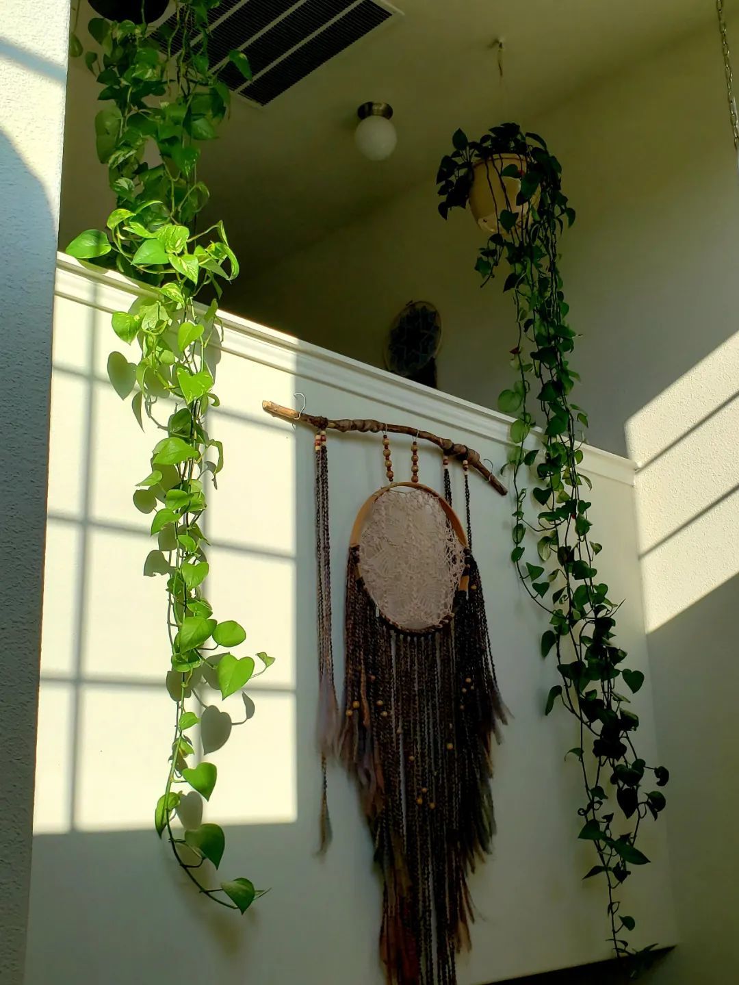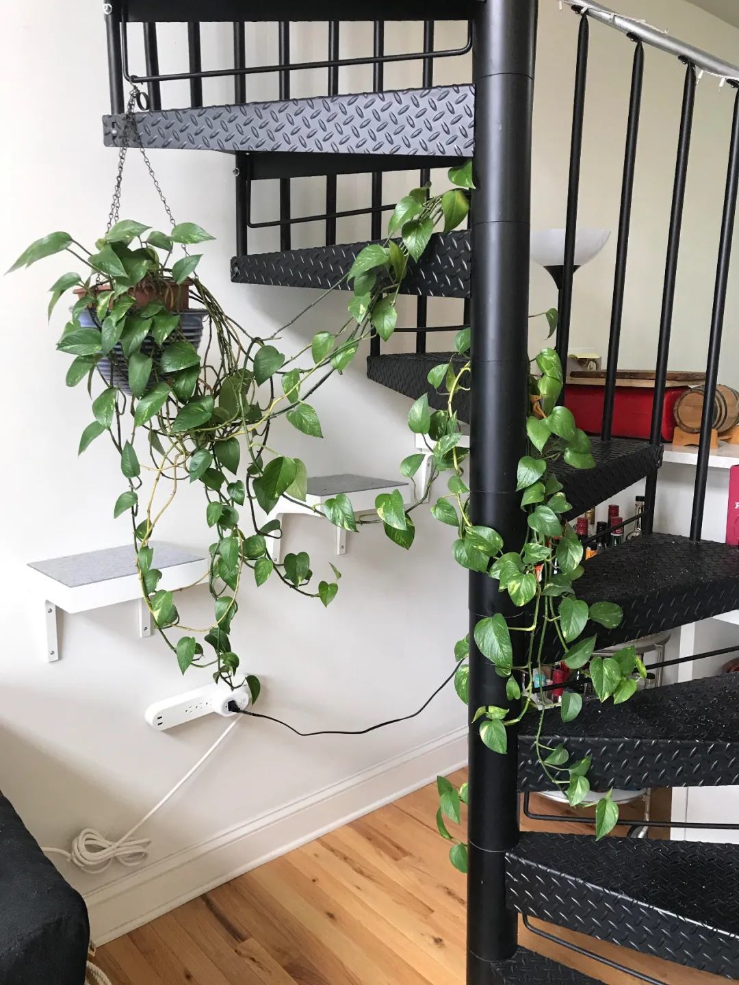 在家里养盆栽绿萝最大的乐趣,就是将它的枝条养的特别长,就是将它的枝条缠绕在楼梯上,或者其他的支架上,让它攀附向上生长,甚至围绕着墙壁生长,或是将绿萝的茎固定在墙壁上,做好一些挂钩,或者是免打图钉。