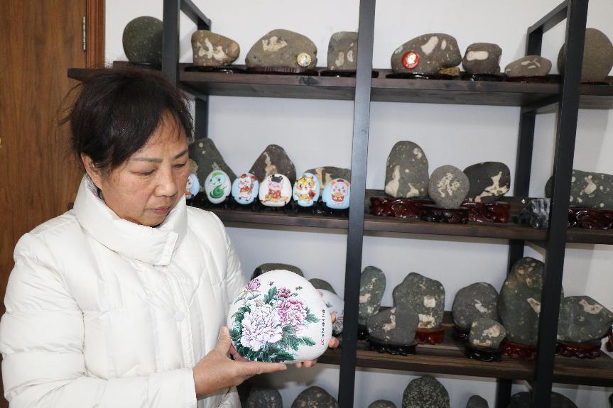 1月16日,在鲁山县汇源街道的一处民宅内,退休教师张峰正在潜心创作一幅石画作品,而在她家的几个展览柜上,数百件大大小小的石画作品色彩艳丽,惟妙惟肖,让人叹为观止。