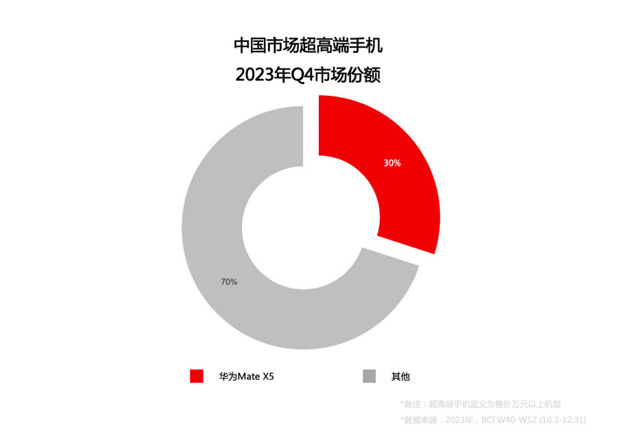 此外,在中国市场超高端手机市场,华为Mate X5也达到了30%的市场份额,也就是每卖出10台万元以上的手机,其中就包含3台华为Mate X5,即使这款手机已经上市数月时间,时至今日也依然处于一机难求的状态,牢牢站稳国内高端手机市场。