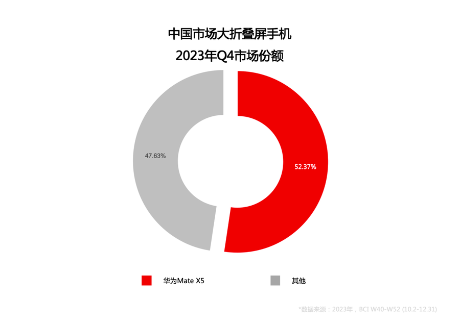 根据近期公布的数据显示,2023年第四季度,中国折叠屏手机市场中,华为以51.23%的市场份额位居首位,其中在大折叠屏手机的细分领域,Q4华为Mate X5的市场份额达到了52.37%,成为近期最热销的大折叠屏手机。