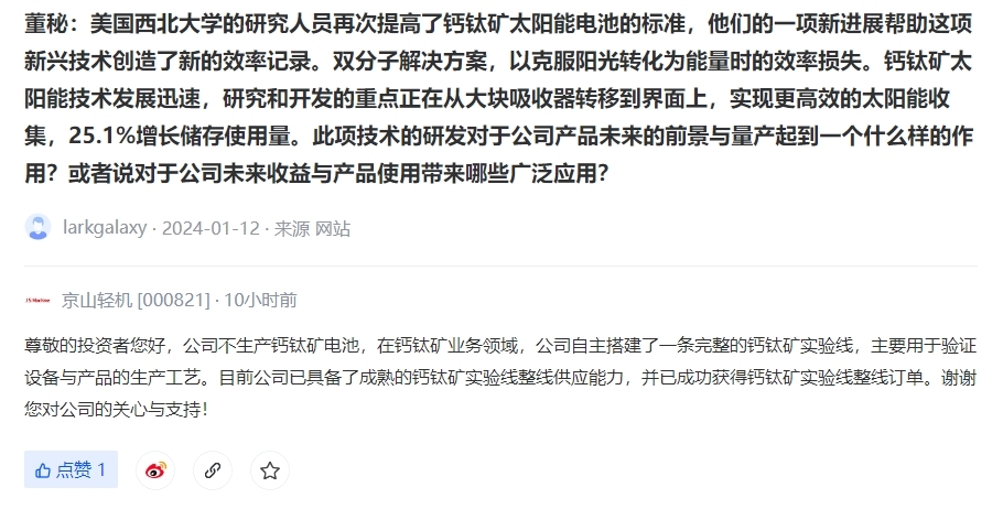 中国财富通1月17日 - 京山轻机(000821)在互动平台上表示,公司不生产钙钛矿电池,在钙钛矿业务领域,公司自主搭建了一条完整的钙钛矿实验线,主要用于验证设备与产品的生产工艺。目前公司已具备了成熟的钙钛矿实验线整线供应能力,并已成功获得钙钛矿实验线整线订单。