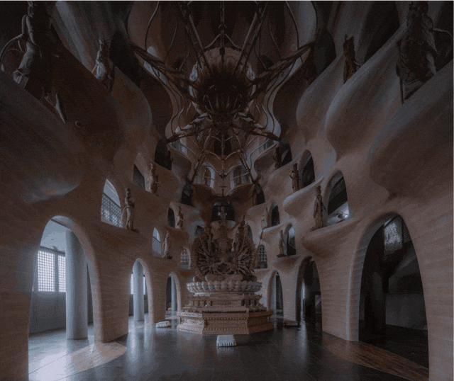 经过构思,韩文强和团队决定在大殿当中内置一个空心的佛塔,然后通过佛塔纵向展示各种不同尺度的佛像。由于香樟木佛颜色深浅不一,他们希望塔本身能成为一个更大的木质雕塑,来中和佛像的色彩差异,所以在壳体结构外层都贴上了木质的表皮。
