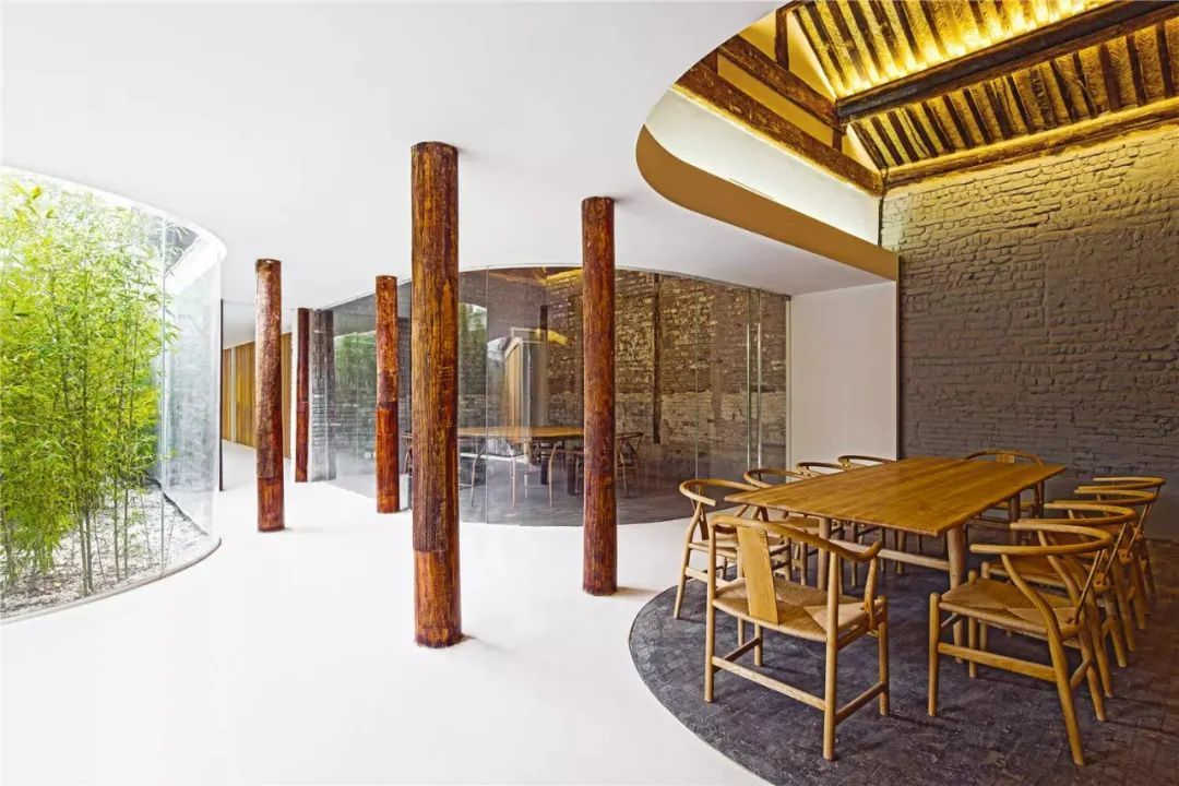 曲廊院的建筑改造,保留了南北房原来的房顶、墙面,包括原有的灰色地面,空间的整体状态朴素、东方;新增加的部分则巧妙地将几个小空间连接起来成为整体,新的部分用纯白色以及透明玻璃做表面,与旧部分的灰褐暗色调形成对比;对于院落景观的改造,韩文强采用了最简单的处理方式——以玻璃墙隔出的茂林修竹景观带,与灯光相互融合。