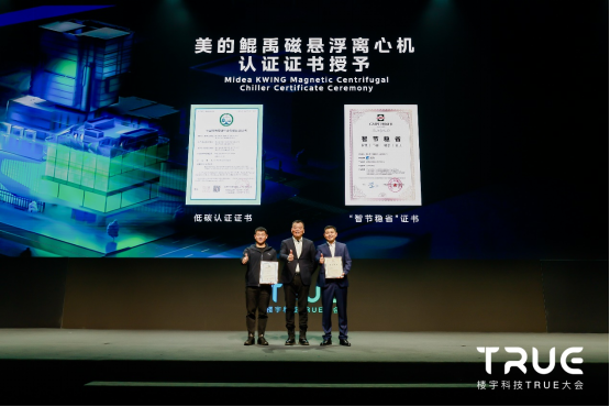 最后,中国制冷空调工业协会理事长、合肥通用机电产品检测院院长、全国冷冻空调设备标准化技术委员会主任委员李江,为美的鲲禹新一代磁悬浮离心机颁发“智节稳省”产品证书、中国制冷空调行业碳足迹及低碳认证证书。