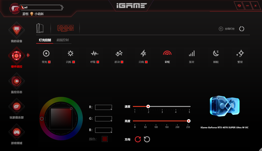 利用iGame Center软件的灯光控制界面下,便可以对iGame显卡的灯效进行设置。