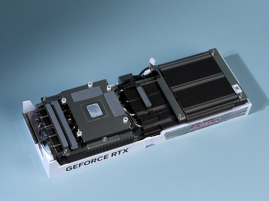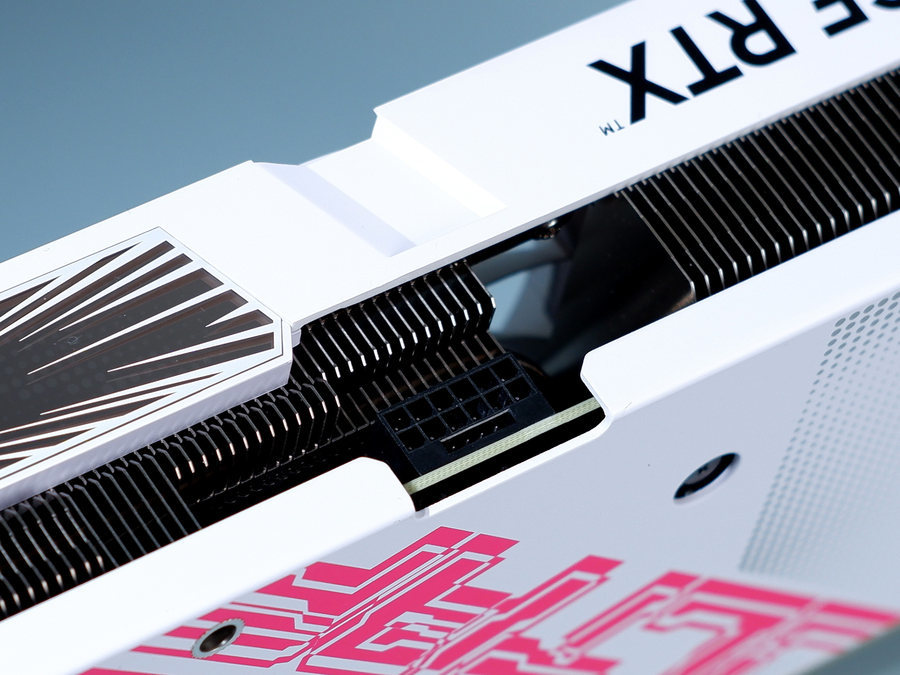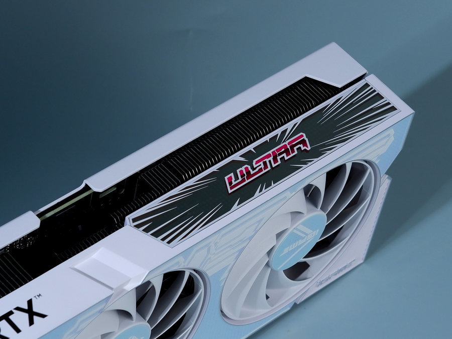 散热器顶部上面印有“GEFORCE RTX”、”ULTRA”的字样。其中”ULTRA”区域设计有RGB灯效模块,能够让这款显卡在运行时更为出彩。