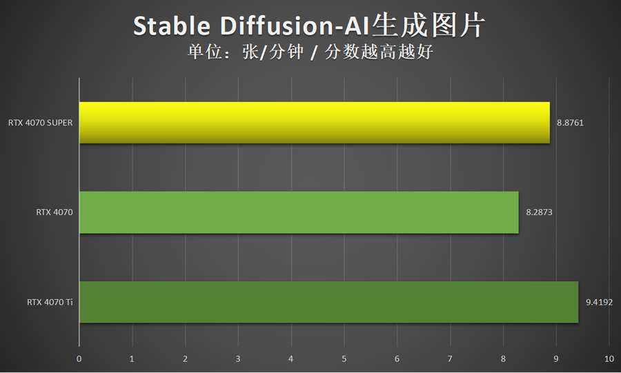 结果显示,iGame GeForce RTX 4070 SUPER Ultra W OC 12GB平均每分钟可生成8.8757张图片,AI绘图创作效率是比较高的。