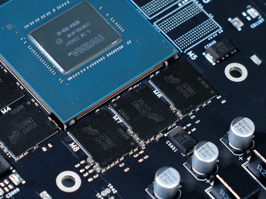 显存是来自美光的GDDR6X,单颗2GB容量。这款显卡PCB正面共设计有6颗显存,组建了12GB显存容量。
