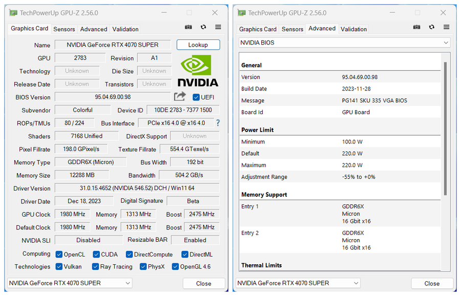 此次测试所选用的这款RTX 4070是一款非公版显卡,其GPU频率为1920MHz,Boost频率为2505MHz,显存频率为1313MHz(等效21000MHz)。