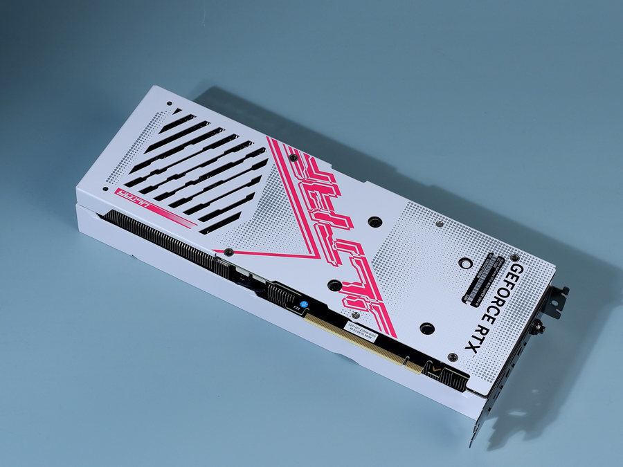 这款显卡配备金属背板。金属背板同样运用了许多波普元素,粉色的ULTRA字母既与侧板色彩相呼应,又与异形的散热镂空相匹配,倍显新潮个性。