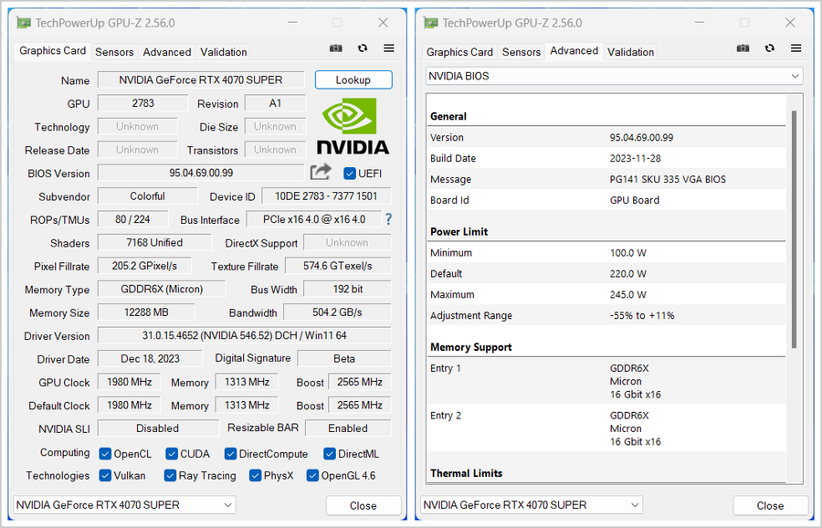 RTX 4070 SUPER基于AD104-350显示核心设计,拥有7168个CUDA核心,搭配12GB容量、192bit位宽的GDDR6X显存。