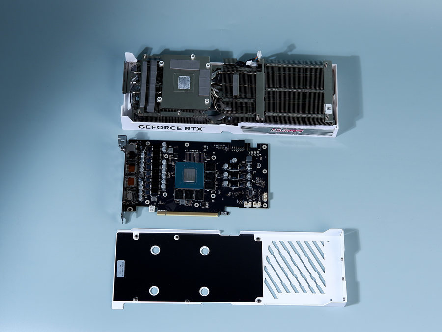 这款显卡虽然长度约32.5cm,但是它的PCB并没有这么长。通过对比明显能够看出散热器和背板比PCB长出很多。