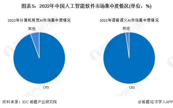 根据 IDC《中国人工智能软件 2022 年市场份额》报告,我国的人工智能软件市场高度集中。其中,在计算机视觉 AI 市场,排名前五的企业占据了 94.5% 市场份额,包含商汤科技、海康威视、云从科技等企业 ; 而科大讯飞、百度智能云、阿里云、腾讯云等龙头企业则占据了语音语义市场 97.8% 的市场份额。