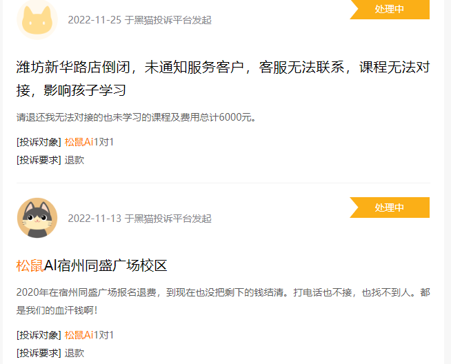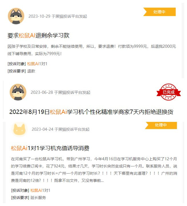 盈利难下,松鼠AI加盟商自然会“想方设法”地提高利润,这也是黑猫投诉平台上会有不少消费者称,松鼠AI相关校区不退学费、不售后、诱导充值的原因所在。