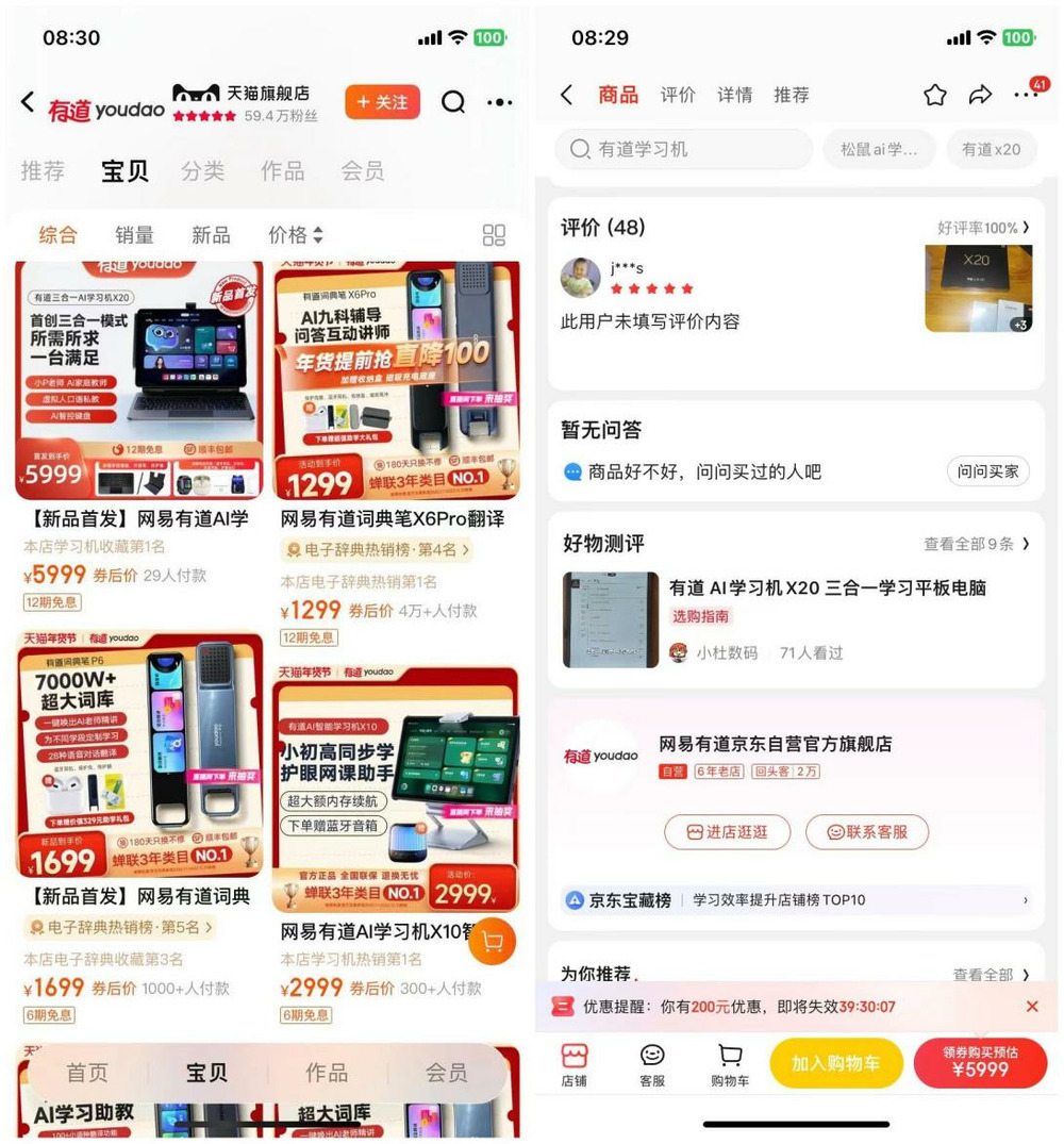 可大模型学习机动辄6000元,甚至过万的价格也劝退了不少家长,大模型学习机销售遇冷。有道X20学习机新品上市10天后,其天猫官方旗舰店付款人数仅有27人,京东官方旗舰店评论数只有48条。搭载文心一言大模型的小度智能学习机P20 Pro和科大讯飞T20学习机近14天在抖音平台,日均销量分别为52台和78台。