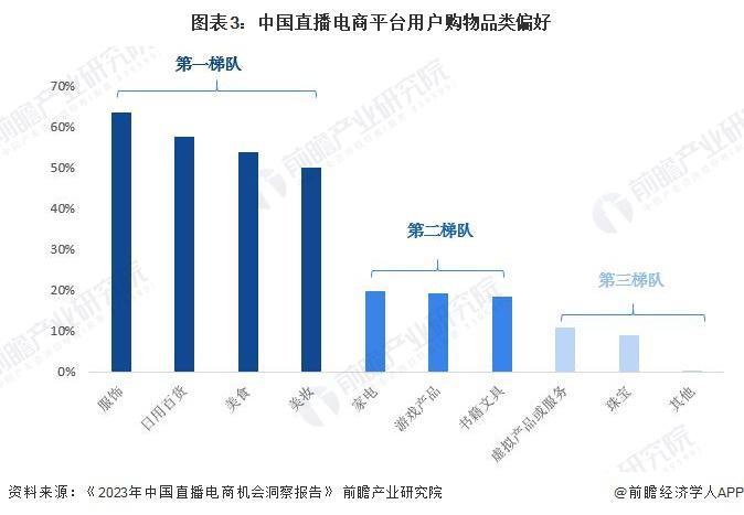 根据微播易、蝉妈妈联合发布的《2023 年中国直播电商机会洞察报告》,用户对于直播电商的购物偏好呈现三大梯队。其中以服饰、日用百货、美食、美妆为第一梯队,超 50% 的直播电商用户偏好在直播电商平台购买服饰、日用百货、美食、美妆。第二梯队包括家电、游戏产品、书籍文具。虚拟产品或服务、珠宝以及其他为第三梯队。未来,服装、日用百货等仍将占领中国直播电商平台用户购物品类偏好大头。