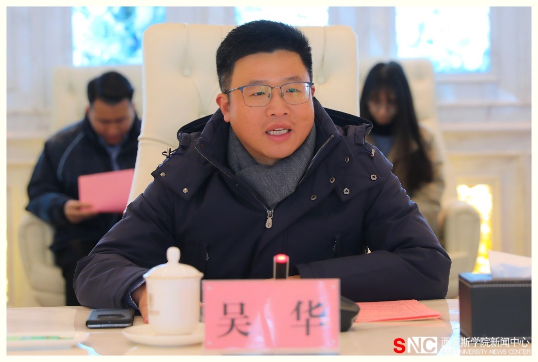 1月19日,清华大学苏世民书院副院长钱小军、院长助理章霁、IT主任郁鹏、IT产品经理李鹤一行四人来访郑州西亚斯学院,交流分享工作经验,共同探讨高校数字化转型。郑州西亚斯学院党委副书记、副校长、工会主席吴华陪同调研。