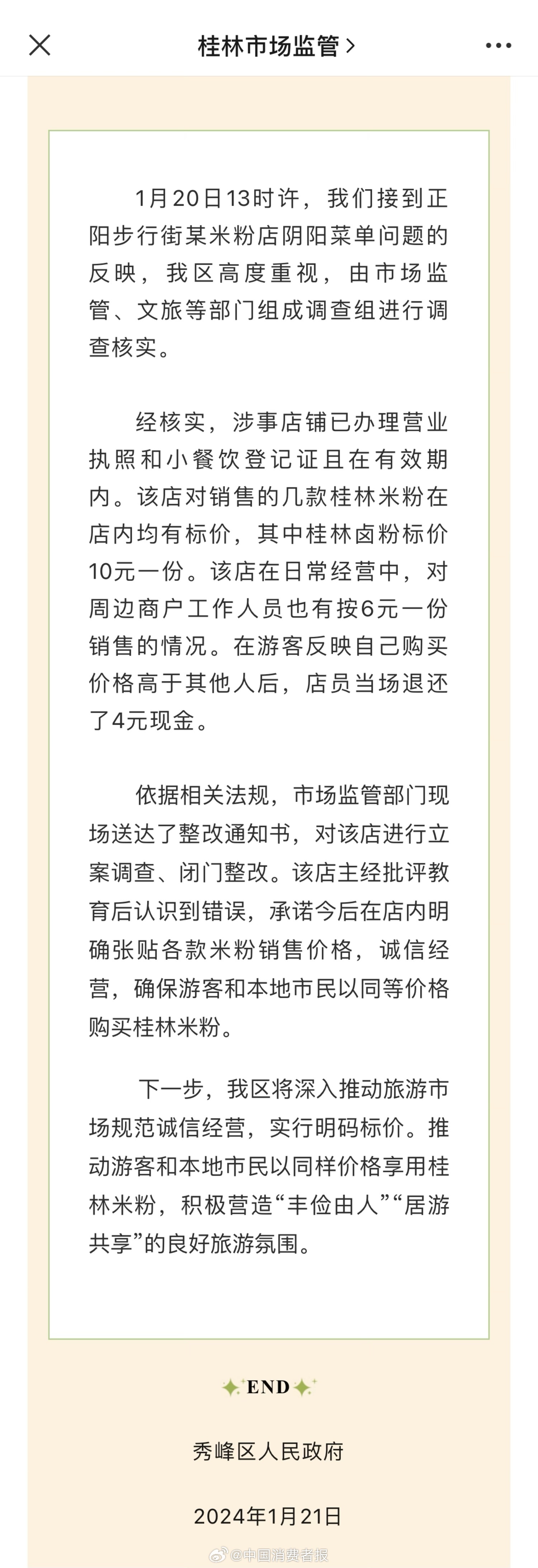 【桂林通报餐馆阴阳菜单问题#】针对“正阳步行街某米粉店阴阳菜单”的投诉,1月21日,广西壮族自治区桂林市市场监管局通报:经核实,该店销售的桂林米粉均有标价,其中桂林卤粉标价10元一份。该店在日常经营中,对周边商户也有按6元一份销售的情况。在游客反映自己购买价格高后,店员当场退还了4元现金。依据相关法规,市场监管部门送达了整改通知书,对该店进行立案调查、闭门整改。