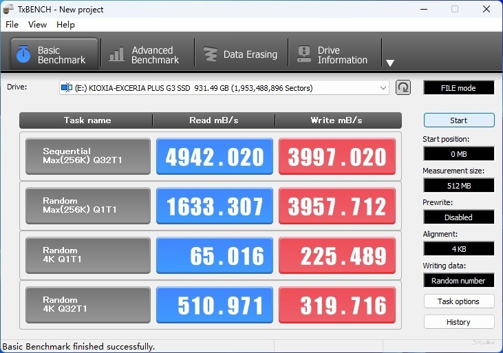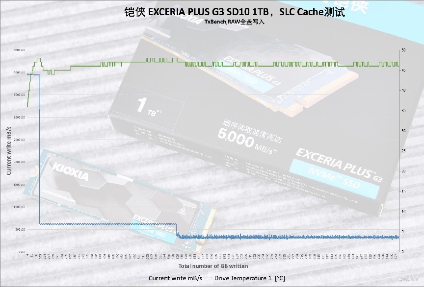 在TxBENCH的读写性能测试与 SLC Cache缓存测试之中,铠侠 EXCERIA PLUS极至光速G3 SD10的顺序读写性能分别为4942.020mB/s和3997.020mB/s;而随机读写性能则分别为1633.307mB/s和3957.712mB/s。测试所得成绩区域间数据和CrystalDiskMark测试得到的数据非常接近,也表明了固态硬盘在不同的测试软件得到的性能数据具备不俗的稳定性。
