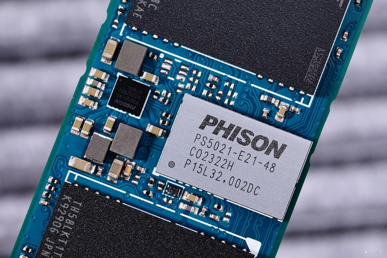 主控芯片采用了群联Phison PS5021-E21-48主控,采用12nm工艺制程,内置32bit ARM Cortex R5处理器,支持3D TLC/QLC NAND闪存芯片,无缓存设计。支持标准PCIe 4.0 X4总线接口以及NVMe 1.4协议,可实现5GB/s、800K IOPS的持续和随机读取速度,在不少高性能的PCIe4.0固态硬盘产品中也能看到这款主控的身影。