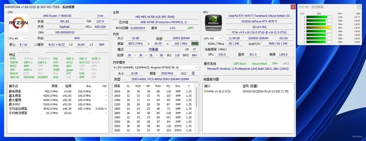 首先我们看看测试的平台配置,为测试时平台核心硬件的性能不会对固态硬盘带来性能拖沓,在CPU部分我们选择AMD的Ryzne 7 7800X 3D搭配微星的MEG X670E ACE主板,显卡部分使用七彩虹 4070TI战斧豪华版OC显卡,内存则是金士顿FURY的16GB内存套装组成。
