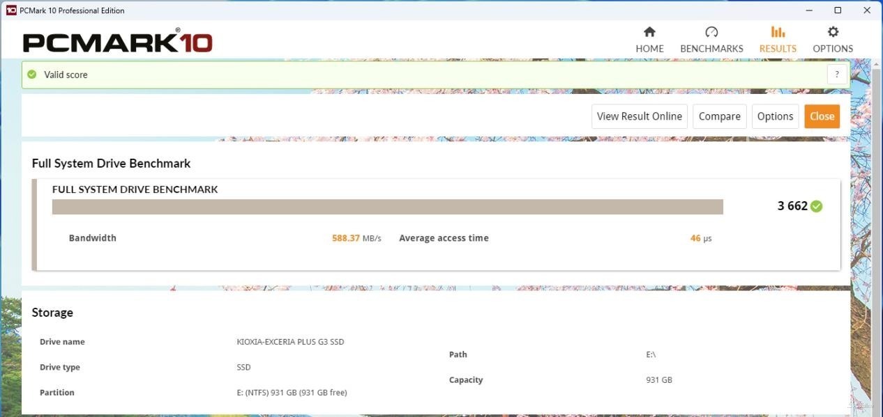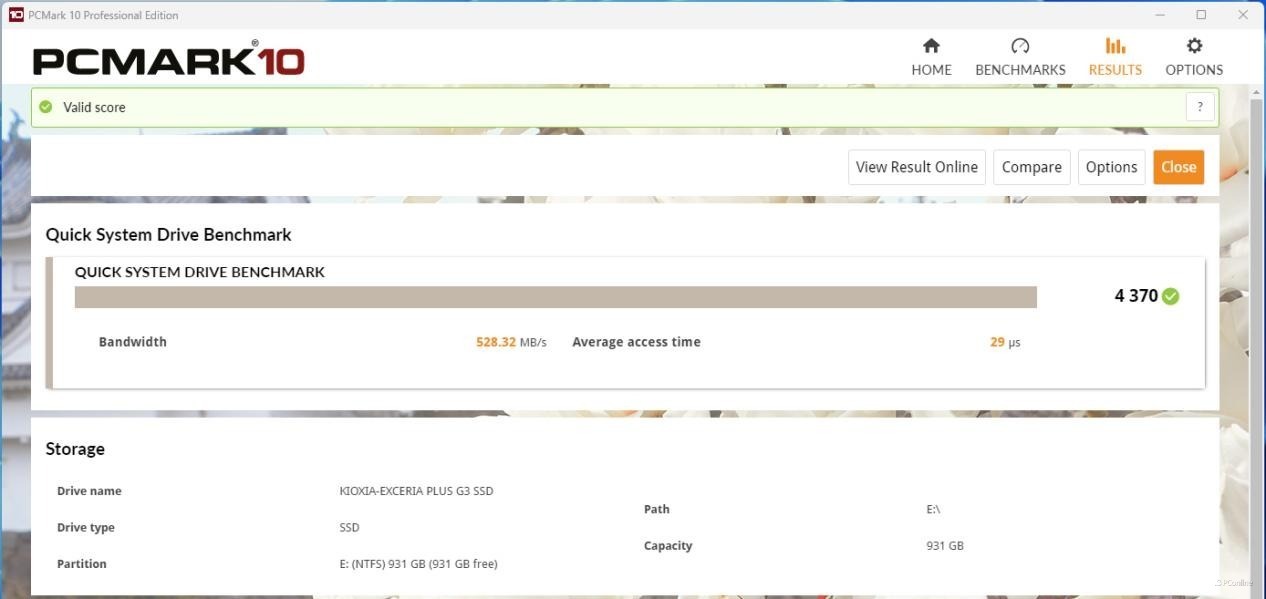 PCMark的磁盘测试中我们选择了Full System Drive Benchamrk以及Quick System Drive Benchamrk两个架构及负载压力均有不同的测试项目进行测试。铠侠 EXCERIA PLUS极至光速G3 SD10在Full System Drive Benchamrk的测试里面,测试成绩为3662,其中测试带宽数值为588.37MB/s,平均寻迹时间为46μs;及Quick System Drive Benchamrk测试里面,测试成绩为4370,其中测试带宽数值为528.32MB/s,平均寻迹时间为29μs,测试数据呈现了铠侠 EXCERIA PLUS极至光速G3 SD10固态硬盘的数据带宽在测试时均超过500MB/s,应对日常办公及大数据量的处理交互有不错的承载以及处理能力。