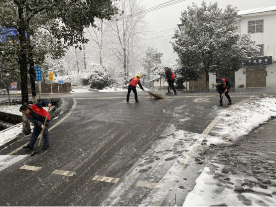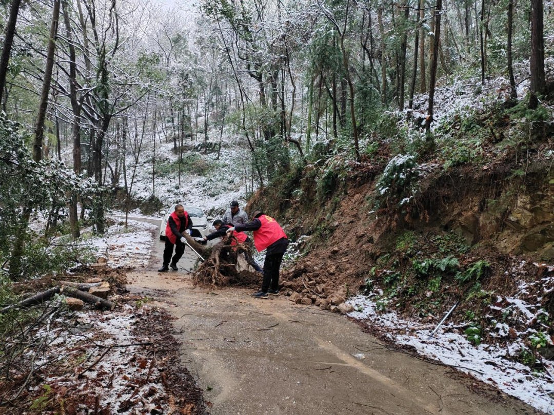 赤山镇枫桥村干部下户排查过程中,对倒塌树木进行清理,消除隐患。赤山镇幕冲村“两委”班子在长睦岭长睦大桥清理路面积雪。