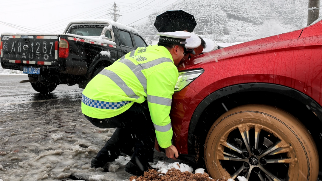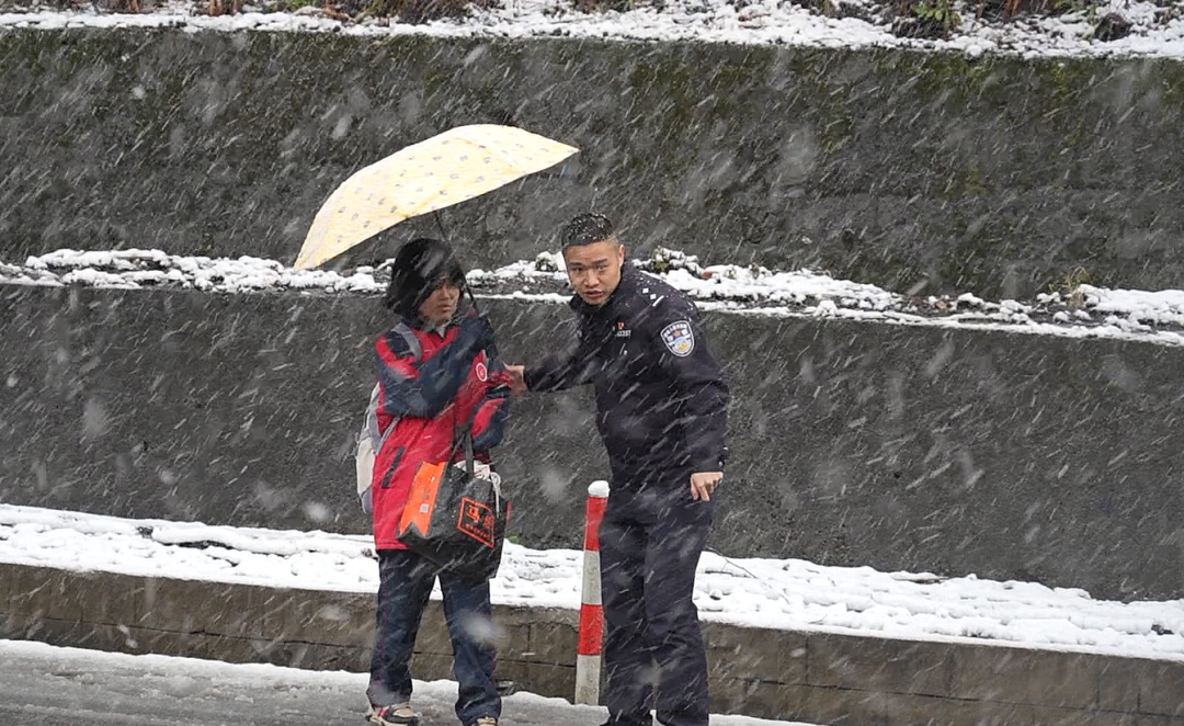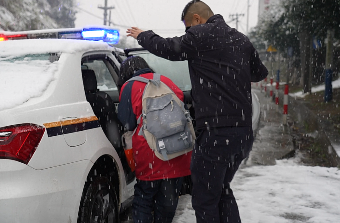上栗公安民警在执行公务过程中,在319国道边发现一名在雪中等车的学生,民警立即将该学生送至上栗中学金山校区。