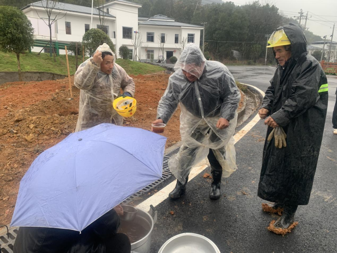 东源乡加强下户排查,消除路面安全隐患,并慰问美丽乡村建设项目施工一线人员,为他们送上御寒的红糖姜茶。